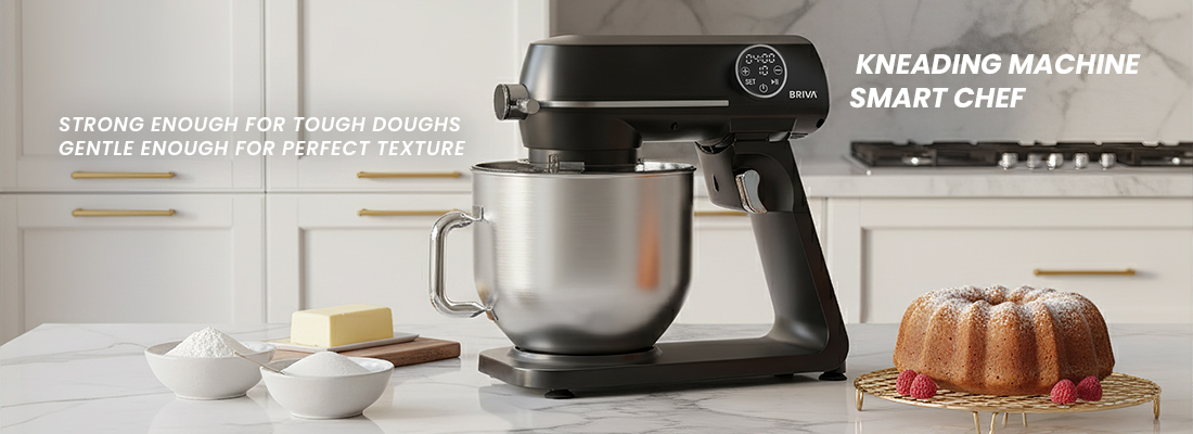 Elegant matte black cast aluminum kneading machine. Provides robust power with 1800-watt motor ensures efficient mixing, kneading, and whipping